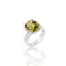 A beautiful ring featuring a cushion-cut peridot gemstone surrounded by diamonds. The double diamond band adds extra sparkle to this elegant piece.